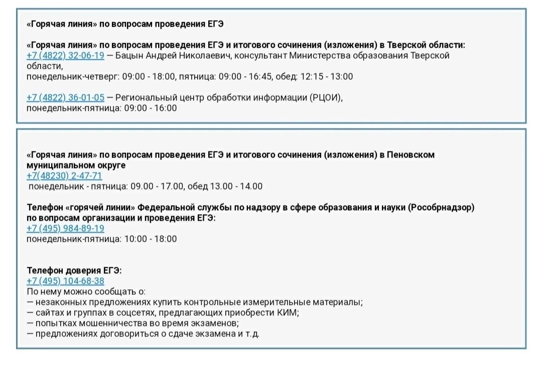 - https://obrnadzor.gov.ru/gia/gia-9/kontakty/ - телефон "горячей линии" и телефон доверия по вопросам ЕГЭ